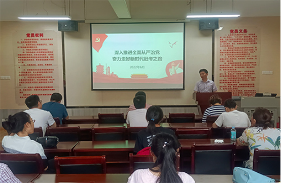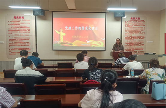 学院党委书记袁宜如、教工第一党支部书记刘妍、教工第二党支部书记胡芳、学生党支部书记刘欣分别以《深入推进全面从严治党奋力走好新时代赶考之路》、《践行两个维护做合格党员,以优异成绩迎接党的二十大召开》、《党建工作的信息化建设》、《疫情中体现党员先锋模范作用》为题,为所在支部党员上了一堂堂生动的党课。