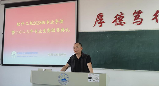 首先,beat365在线唯一官网院长邓安远教授对专业导读暨颁奖典礼做了致辞。邓院长代表学院全院师生向获奖的同学表示了祝贺,希望他们再接再厉,再创佳绩,同时向新入学的2023级软件工程专业全体同学表示了热烈的欢迎。邓院长在致辞中回顾了计算机学院软件工程专业的办学历史,总结了专业的建设成效;希望软件教研室师生,围绕特色化应用型软件工程专业建设,在教科研各方面展现自己的活力;同时,勉励同学们“立报国志、奉敬业情、牢记‘竞知向学、厚德笃行’的校训”,用自己的汗水、努力和智慧做画笔,为自己的人生之路、大学生活描绘五彩斑斓的色彩。