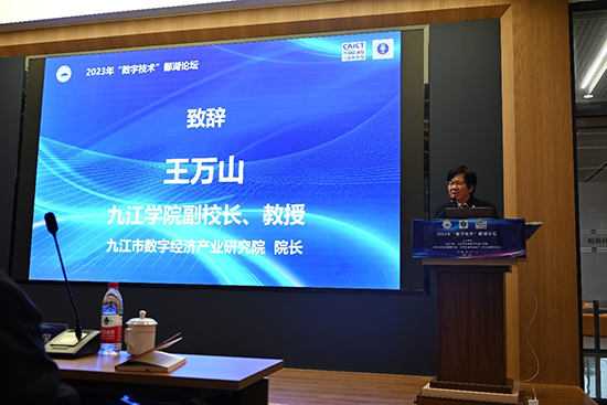 王万山在致辞中表示,2023年数字技术鄱湖论坛在九江学院召开是一大盛事,来自全国各地的数字技术及计算机与人工智能领域的专家、同仁欢聚一堂,共叙友谊,交流学术成果。本次数字技术鄱湖论坛的主旨是为来自国内外本领域内的专家学者搭建一个学习与交流的广阔平台,希望与会专家学者为大家带来国内外数字技术领域的最新进展动态,分享各自团队最新研究成果,并通过平台收获真诚的友谊,在未来的工作中加强合作与交流。