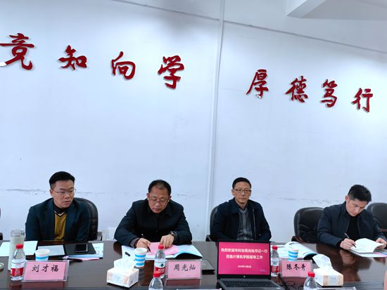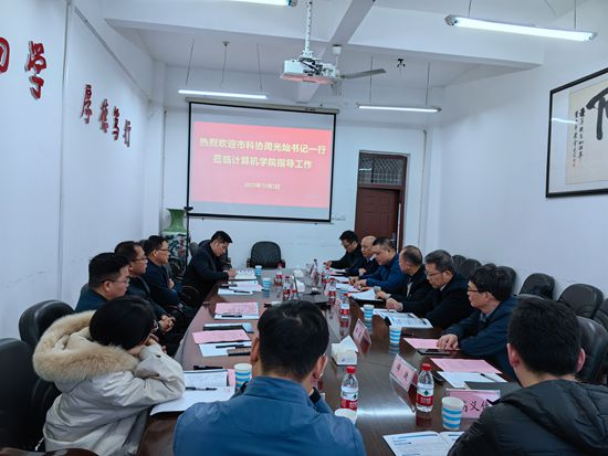12月2日下午,九江市科协党组书记周光灿一行深入我校beat365在线唯一官网进行调研并召开座谈会。副校长严平出席会议并讲话。市科协副主席陈冬青、学会部负责人和市电子学会秘书长、江西才气软件技术有限公司负责人刘才福等陪同调研。beat365在线唯一官网院长邓安远、副院长彭虎、博士教师代表、科技园企业代表等参加调研座谈活动。
