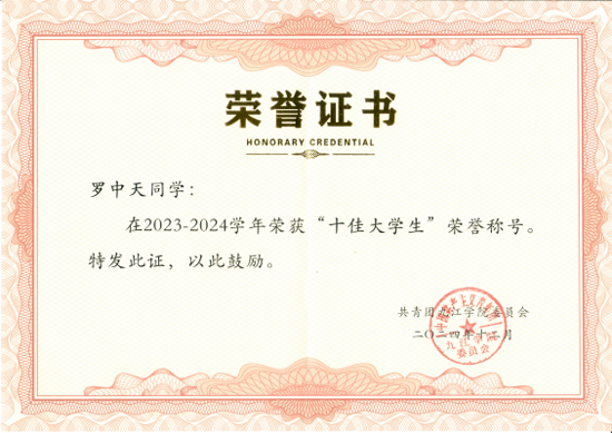 罗中天,男,汉族,江西抚州人,beat365在线唯一官网2021级计算机科学与技术专业本科生。作为中国特色社会主义新时代青年大学生,他秉承校训“竞知向学,厚德笃行”的精神,致力于AI学术研究,社会志愿服务,创新创业等多个领域。荣获“国家奖学金”、“十佳大学生”、第三届创研杯全国大学生英语词汇全国决赛特等奖、中国国际大学生创新大赛(2024)省赛铜奖、2024年全国大学生数学建模竞赛省三等奖等四十余项奖项。