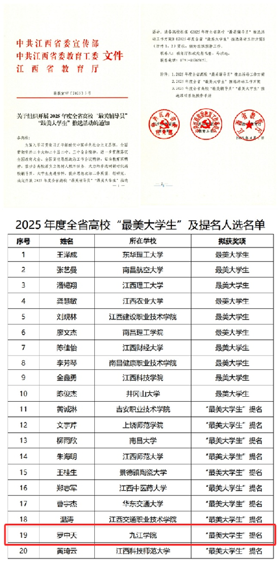 近日,中共江西省委宣传部、省委教育工委、省教育厅联合公布了2025年度全省高校“最美辅导员”“最美大学生”推选结果。根据《关于组织开展2025年度全省高校“最美辅导员”“最美大学生”推选活动的通知》(赣教宣字〔2025〕5号)精神,经学校推荐、网络初审、现场会评等环节,九江学院beat365在线唯一官网2021级计算机科学与技术专业本科生罗中天同学荣获全省“最美大学生”提名荣誉称号。该奖项全省共评选20人(10人获奖10人提名),旨在表彰在德才兼备、奋发向上的优秀大学生,是全省高校思想政治工作和师生表彰体系中的重要组成部分。