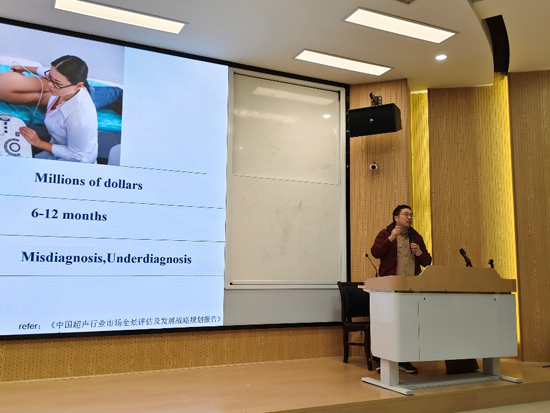 檀韬副教授从当前超声诊断医生数量不足、病患诊疗等待时间长、诊疗准确率不高等现实问题出发,通过对超声基础模型与通用医学影像模型的研究,能够深入理解多模态影像特征与解剖上下文关系,研发出通用的超声高准确率智能诊断设备。在超声诊断研发过程中,基础模型通过海量无标注数据预训练,掌握跨部位超声通用表征;通用模型则适配多种专科诊断任务。二者协同,实现从自动测量、病灶识别到报告生成的端到端智能辅助,显著提升诊断效率与一致性。在自由交流环节,檀韬副教授耐心解答了师生在超声去噪、多模态模型构建、多任务模型训练等方面提出的问题,并与师生进行了深入的讨论。