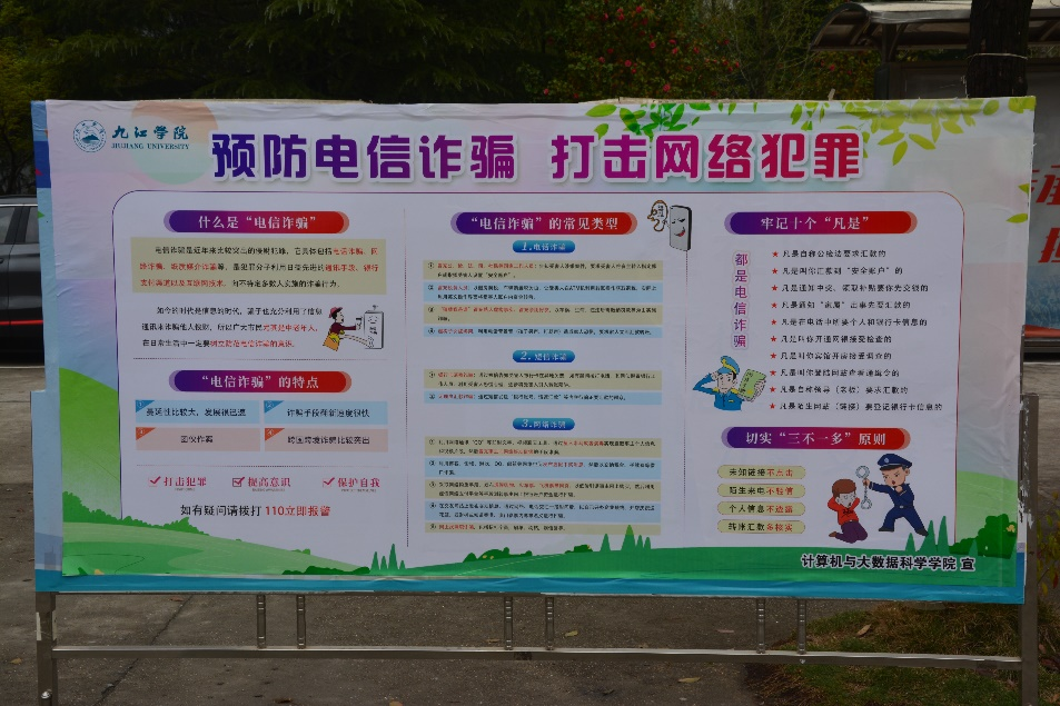 为了认真贯彻落实省委省政府关于平安建设的工作要求,提高大学生的防诈骗意识,3月23日,计算机学院在三食堂广场组织参加了以平安建设为主题的防电信诈骗活动。