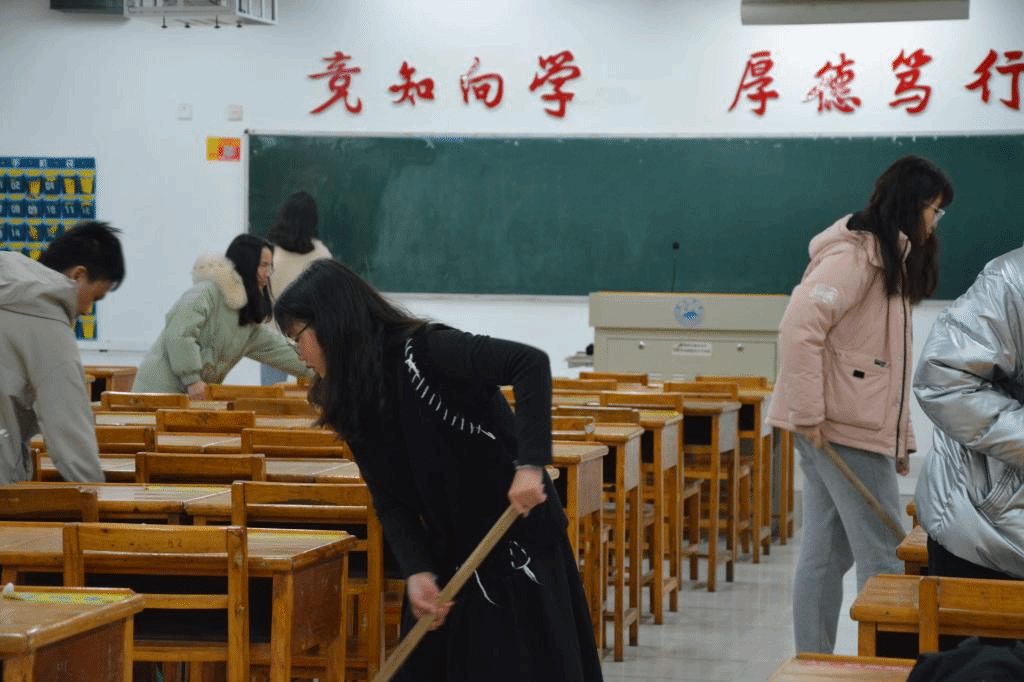 活动初始,入党积极分子认真学习了国务院关于全面加强新时代大中小学劳动教育意见,随后走进各教室进行卫生打扫。他们清理了角落里的垃圾,擦洗黑板,把散落在课桌抽屉里的传单收起,桌椅摆放整齐。他们用行动贯彻落实了此次劳动教育活动的衷旨。