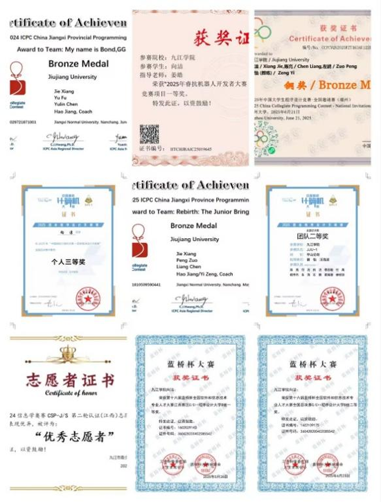为实现“以赛促学、以赛促练”,她全身心投入学科竞赛,在国家级赛场屡创佳绩,接连拿下2025睿抗机器人大赛全国一等奖、2025年第16届蓝桥杯全国软件和信息技术全国二等奖、2025年CCPC全国邀请赛(福建)全国铜奖、2025年团体程序设计天梯赛团队全国二等奖及个人全国三等奖。在省级赛事中,她更是多次登顶领奖台,2024-2025年连续两年将蓝桥杯江西赛区C/C++组一等奖、睿抗机器人大赛江西赛区一等奖收入囊中,同时斩获ICPC江西省大学生程序设计竞赛铜奖、中国大学生计算机设计大赛江西省赛二等奖等多项荣誉,在校级赛事中也拿下学院首届传智杯程序设计大赛校赛一等奖,用实干诠释了“竞知向学厚德笃行”的校训精神。