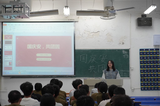 各班级团支书通过精心制作的PPT,结合历史史料与时代热点,从开国大典的庄严时刻讲到新时代的发展成就,重点聚焦大数据、人工智能等领域的国家重大突破,让同学们体会到个人与国家发展的紧密联系。为增强互动性,PPT 讲解中还穿插了“国庆知识闯关”环节,团支书们设置了国旗设计寓意、国庆历史事件、科技成就对应等趣味题目,同学们踊跃抢答、热烈讨论,在问答中巩固爱国知识,深化民族自豪感。