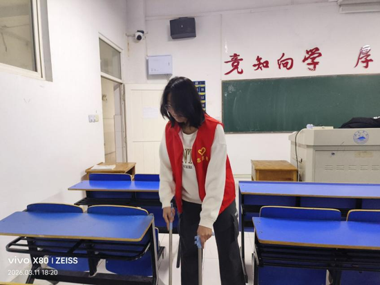 下午6:10,志愿者们准时在指定地点集合,统一前往目标教室,满怀热忱开启志愿服务。抵达后,志愿者们迅速分工协作,按照计划开展清扫工作,手持扫帚、拖把、抹布等工具,对教室地面、课桌、讲台、门窗及卫生死角进行全面清理,仔细擦拭黑板、清除课桌污渍,清扫纸屑灰尘,不放过任何一处细节,全程认真细致,用实干诠释雷锋精神。经过齐心协力打扫,原本杂乱的教室焕然一新。