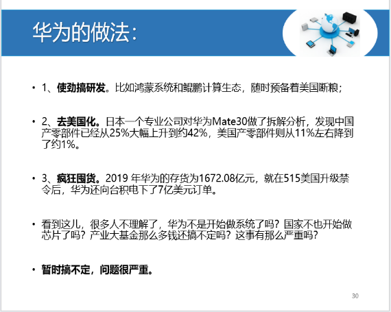 毫无疑问,中国的技术攻势对美国构成了前所未有的挑战;5G技术处于正在形成的未来技术和工业世界的中心,到2025年,以5G为动力的工业互联网可能创造23万亿美元的新经济机会;中国已经偷偷抢滩,现在5G领域处于领先地位。华为现在是除北美以外所有大陆的领先供应商,而美国没有设备供应商;未来几年内,5G全球版图和应用主导地位格局将成。5G依赖于一系列技术,包括半导体、光纤、稀土和材料,这些基础技术中国已经全部国产化。中国领先会让美国失去制裁的权力。