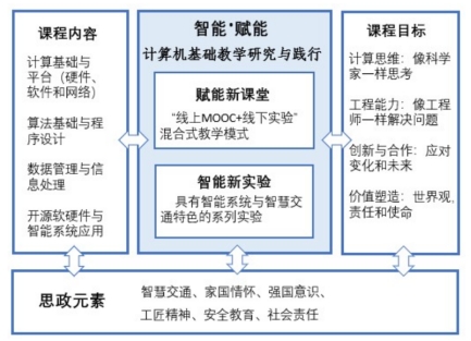 2.案例简介:大学计算机基础课程是一门理论和实践相结合的大规模通识教育课程,具有覆盖专业多、学生差异大、课程学时少、知识点更新快、课外学时有限、实验室有限等诸多特点。随着各学院对学生的新技术知识能力的要求和重视程度越来越高,教学团队重新审视课程目标,修订课程大纲,优化教学内容,融入思政元素,开展了以“人-机-物智能·赋能”为核心的大学计算机基础教学研究,通过近年来的课程实践,获得较好成效。建设总体框架如图1所示。