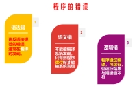 程序的错误有哪些? (思政元素:引导学生编写程序要有严谨的态度,碰到错误时要耐心调试) 1.语法出错:编译时发现。 2.语义出错:运行时发现。 3.逻辑错:运行结果不正确。