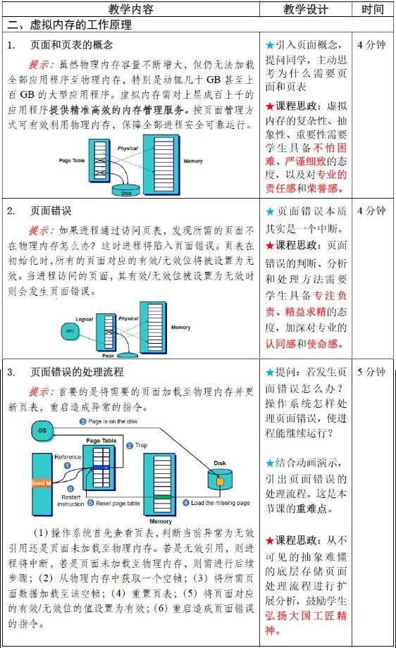 3.思政目标:成为国产操作系统内存技术人才;通过分析虚拟内存产生的背景和动机,厚植爱国主义情怀;通过讲授虚拟内存缺页与处理流程,弘扬大国工匠精神;