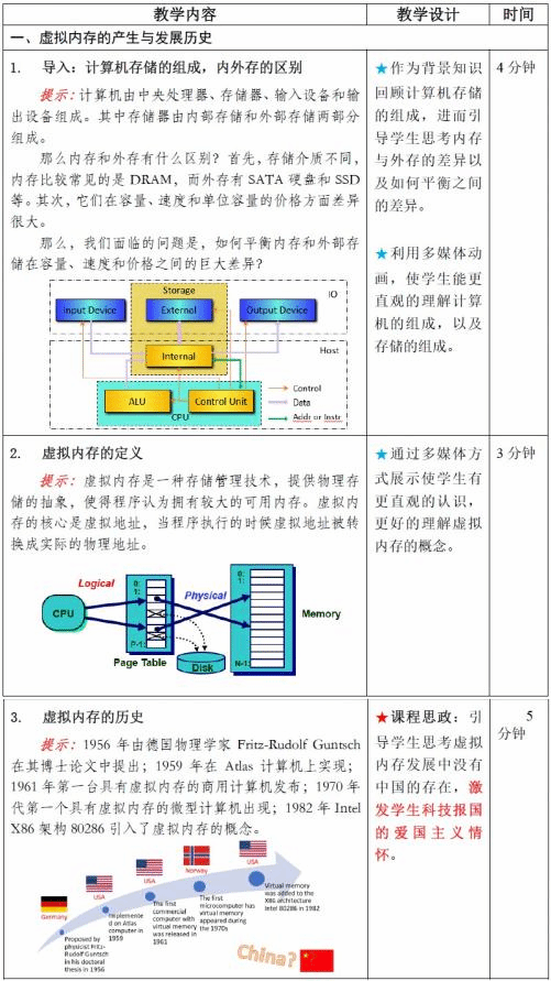 1.与真实案例深度融合。将虚拟内存发展历史的知识点与真实人物和事件紧密结合,图文并茂,通过真实案例触动和激发学生的爱国情怀。