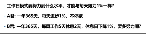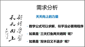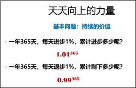 通过函数应用举例让学生理解函数的作用,掌握函数应用的方法,谈“感言”引发学生深入思考和讨论,让学生自己悟出人生道理。:每天进步一点点,做最好的自己;每天偷懒一点点,差之千里。每天努力多一点和每天偷懒一点点经过一年的差距是巨大的。每天多努力一点,积累下来就是巨大的财富。积少成多,水滴石穿,每天都要进步,哪怕一点点。
