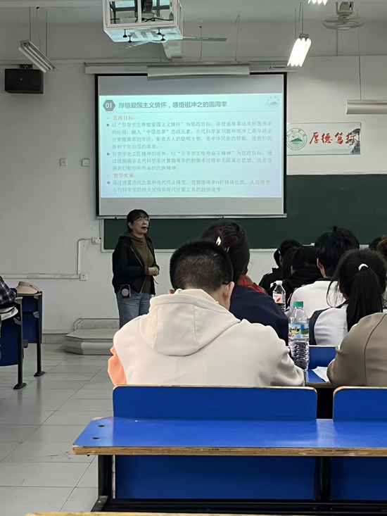 10月28日,beat365在线唯一官网张丽芬老师在计科A2552班开展《程序设计基础I》课程思政示范课。张老师以“祖冲之的圆周率与编程中的迭代思想”为主题,将中华优秀传统文化、奋斗进取精神与程序设计专业知识深度融合,呈现了一堂兼具知识性、思想性与趣味性的课程思政教学示范课。学院教学督导及各教研室教师代表走进课堂听课,共同探讨课程思政与专业教学的融合路径。